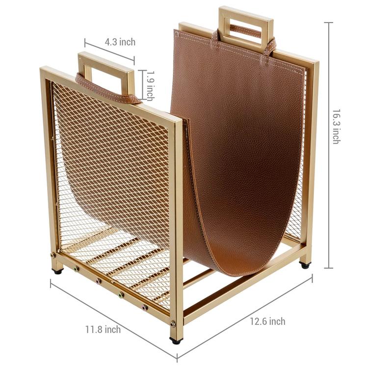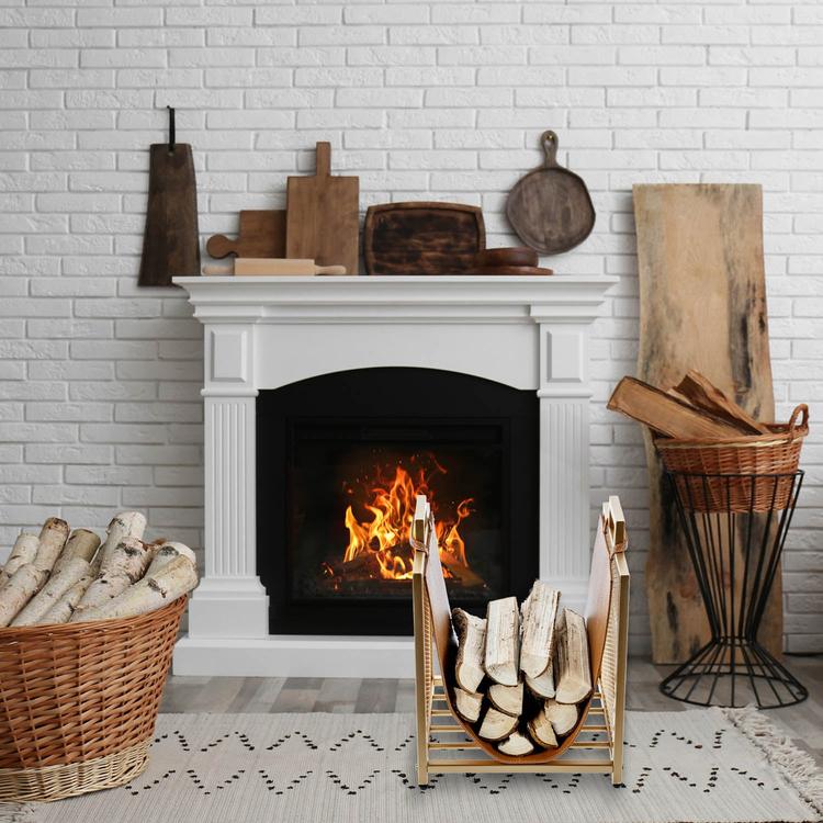 - Compact fireplace wood storage rack with gold-toned metal frame and brown leatherette sling style holder for kindling and sticks