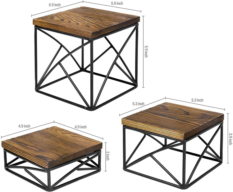 Create stylish and eye-catching food displays for any wedding, café or bakery with this set of 3 dark wood square display risers with black metal wire bases. Used individually or in a tiered arrangement, these riser racks are a great way to showcase any delicious culinary confections or showcase merchandise in a retail store or boutique. The tabletop design allows these stands to be placed on any flat surface to add an attractive accent to any display. Simply nest inside each other to save space while storing. Highlight your cakes, pastries or appetizers perfectly with these modern square pedestals with dark wood platforms and black metal wire geometric design bases.
