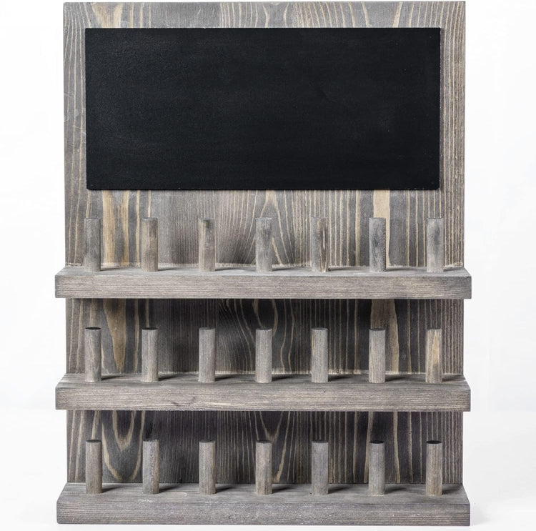 Enhance your personal collection or retail display with our vintage gray wood ring storage rack. Featuring 21 pegs, each accommodating 5 or more rings, this versatile rack holds over 100 rings in total. Whether wall-mounted or freestanding, its solid wood construction and weathered gray finish offer a rustic touch. The attached erasable chalkboard lets you personalize your display, while portability makes it perfect for various settings. Craft fairs, markets, or home collections, this rack shines with practicality and style.